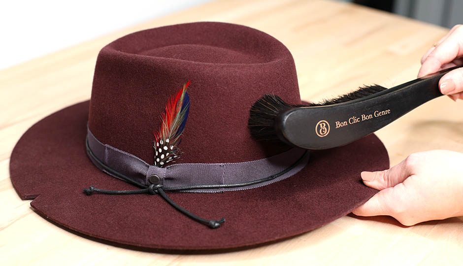 Snelle reinigingGebruik een zachte borstel met fijne haren om stof te verwijderen en de natuurlijke glans van uw hoed te herstellen. |