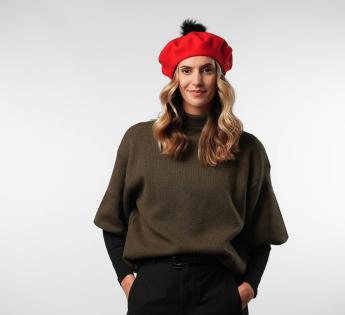 Gemaakt van pure merinowol, is deze Franse baret versierd met een speelse pompon, wat een vleugje fantasie toevoegt aan een klassieker die opnieuw is uitgevonden. De diepzwarte nep bont pompon contrasteert met de levendige kleur van het vilt.