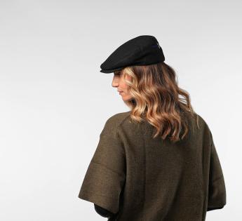 Ivy flat cap herzien met een artistieke en eigentijdse touch. Aan de achterkant creëert een abstract borduurwerk in levendige kleuren, bedacht en vervaardigd in ons atelier, een opvallend contrast van vormen en materialen.