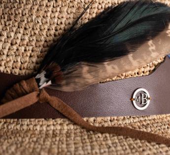 Deze Traveller hoed van gehaakte raffia valt op door zijn uitgesneden leren ceintuur, waarvan het reliëf een bergketen aan de horizon tekent. Deze verfijnde mix van materialen—leer, suède en natuurlijke veer—roept de pure schoonheid van een ongerept landschap op.