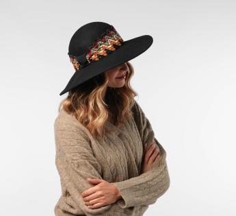 Flaphoed van gevilte wol, gemaakt in Italië, met een soepele en elegante silhouet. Het valt op door een gevlochten trimmen met veelkleurige zigzagpatronen, die een bohemien en heldere toets aan het geheel geven. Een opvallend spel van texturen voor een hoed vol persoonlijkheid.