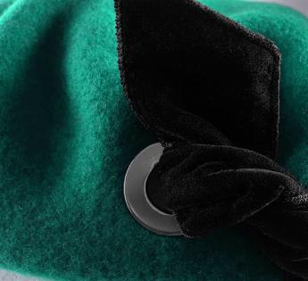 Deze heruitgevonden baret speelt met contrasten met lef en verfijning. De Baskische vorm, met een middelgroot snit, wordt getwist door een duo van sterke details: een met de hand gevlochten fluwelen strik en twee metalen oogjes die de silhouet moderniseren. Een subtiele balans tussen traditie en design, ontworpen voor een zelfverzekerde vrouwelijke uitstraling.