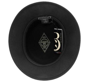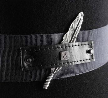 Gedurfd en gestructureerd, deze wol vilt vissershoed verleidt met zijn eigentijdse uitstraling. Het is versierd met een brede grosgrain hoedenband, afgewerkt met een metalen veervormige trimmen, bevestigd op een doorgestikte leren tab.