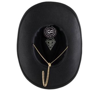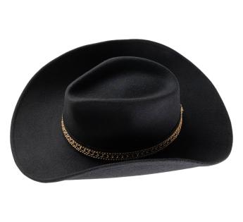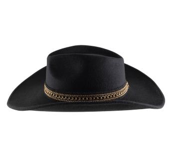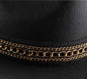 Gemaakt van wol vilt, is hij zowel warm, waterbestendig als duurzaam. De hoedenband versierd met gouden kettinkjes voegt een lichte en contrasterende toets toe, tussen classicisme en durf. De fijne kinband in kettingstijl benadrukt zijn karakter en zorgt voor een zekerdere draagwijze.