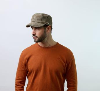 Militaire pet met een vintage uitstraling dankzij het versleten leer. Met een vrij ruwe uitstraling past het perfect bij de aard van dit serieuze en beschermende hoofddeksel. Het soepele leer is op sommige plaatsen geperforeerd om ons hoofdhuid beter te ventileren. Het is een model dat voor de winter is ontworpen en dus warm en gezellig is.