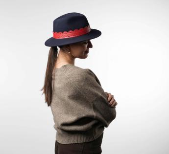 De hoedenband van imitatieleer, bewerkt als opengewerkt kant, voegt een vleugje zelfverzekerde vrouwelijkheid toe. Het intense contrast geeft een bohemien en rock chique energie. Het discrete Label markeert onze ambachtelijke creatie. Deze hoed belichaamt de perfecte balans tussen verfijning, originaliteit en vrijheid van stijl.