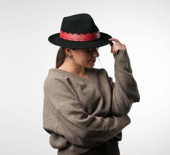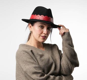 De hoedenband van imitatieleer, bewerkt als opengewerkt kant, voegt een vleugje zelfverzekerde vrouwelijkheid toe. Het intense contrast geeft een bohemien en rock chique energie. Het discrete Label markeert onze ambachtelijke creatie. Deze hoed belichaamt de perfecte balans tussen verfijning, originaliteit en vrijheid van stijl.
