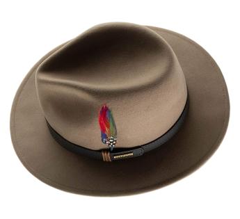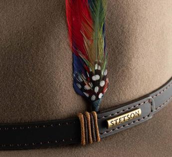 De gestikte hoedenband van leer voegt een vleugje authenticiteit toe, terwijl de afneembare kleurrijke veer een expressiever accent biedt. Een model met een vrije geest, dat elegantie zonder rigiditeit omarmt.