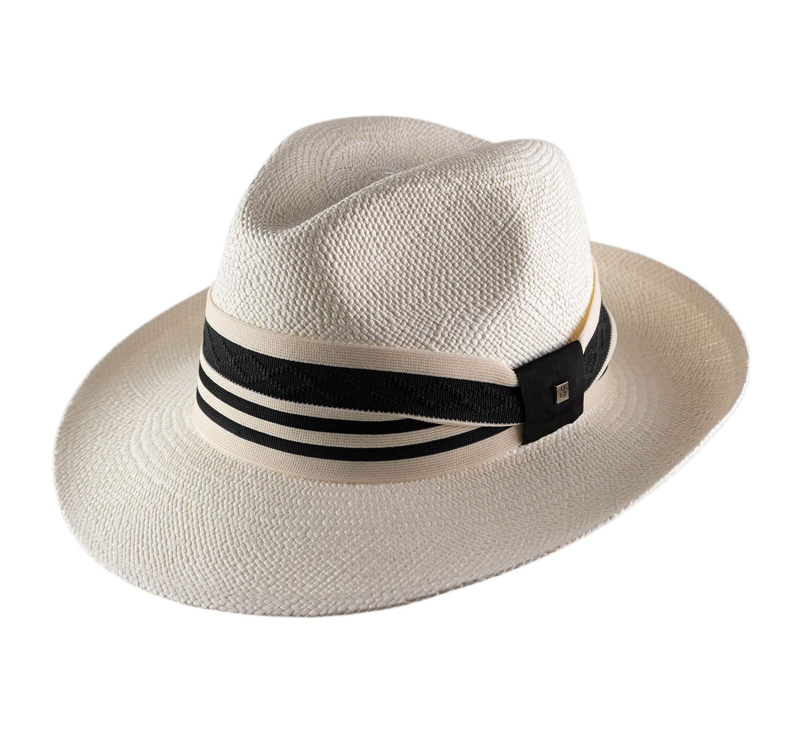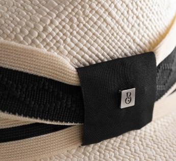 Ambachtelijke elegantie en sportieve uitstraling komen samen in deze uitzonderlijke Panama hoed, vervaardigd in onze Lyonse werkplaats. De hoedenband in textuurgebreide stof, geïnspireerd op het polo, is verfraaid met een bicolore satijnen ring voor een verfijnde touch. Een lichte en ademende hoed, perfect voor een chique en casual look.