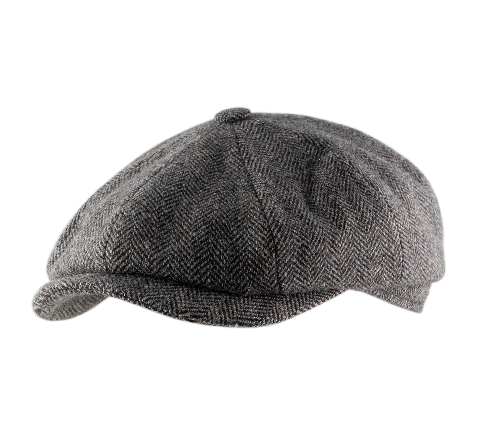 Ballon cap gevormd uit 8 panels en gemaakt van een wollen stof met visgraat. Het heeft een mooi gebogen vizier dat een moderne touch toevoegt. Met zijn pofvorm kun je met het volume spelen door het naar één kant te vouwen, maar altijd met een solide charme.
