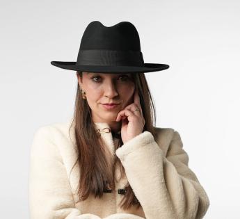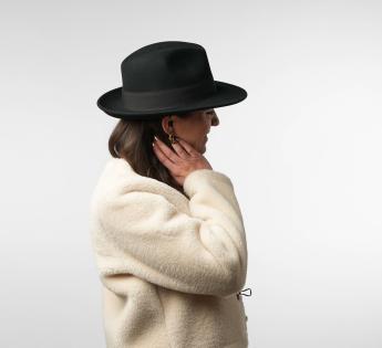 De tijdloze Fedora hoed. Liefhebber van vilt, deze hoed verfraait een eenvoudige outfit, vooral in de winter. Met zijn effen kleur en hoedenband in ton-sur-ton grosgrain voegt hij volume en warmte toe aan je outfit. Je kunt hem opvouwen voor gemakkelijk transport en hij is behandeld om waterbestendig te zijn.