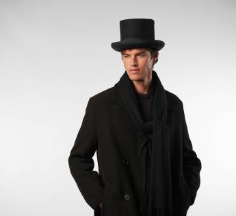 Deze hoge hoed van gehard wol vilt belichaamt elegantie in zijn puurste vorm. De bewust geaccentueerde hoge kroon creëert een majestueuze verticale lijn, een ontwerpershandtekening van grote ceremoniële silhouetten. Het stijve vilt, met precisie bewerkt, zorgt voor een onberispelijke pasvorm en een verfijnde afwerking.
