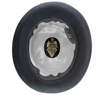 Versierd met een discrete grosgrain hoedenband, speelt het de kaart van verfijning zonder overdaad. Perfect voor ceremonies, verfijnde stadskleding of dandy-geïnspireerde silhouetten, deze hoed overstijgt de tijdperken met adel en distinctie.