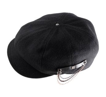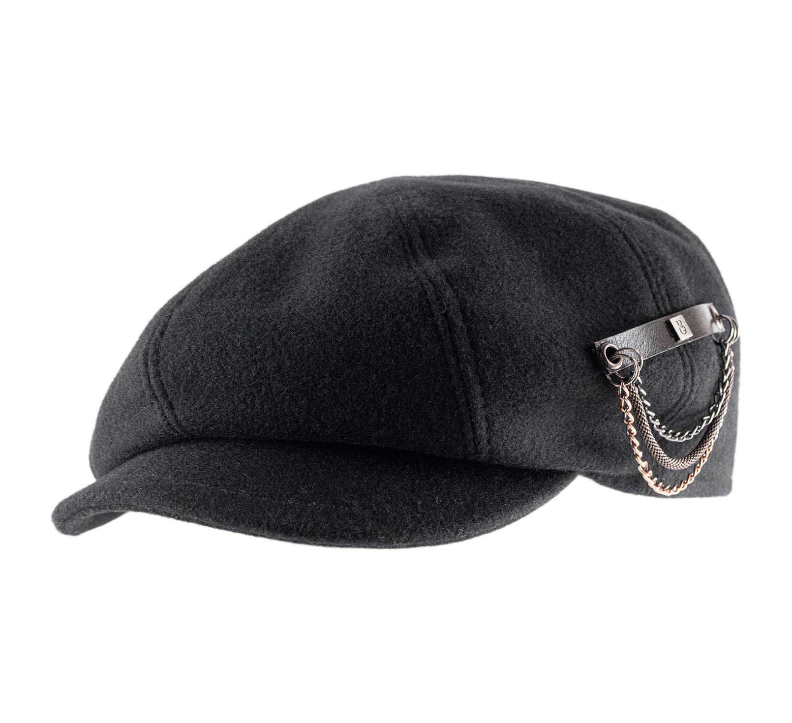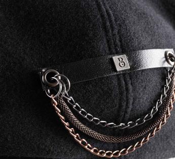 Deze pet doorbreekt de codes met lef. De eigenzinnige lijn, gecombineerd met leren trimmen en metalen kettingen die in onze werkplaats in Lyon zijn toegevoegd, creëert een perfecte balans tussen rockuitstraling en verfijning. Gemaakt in Italië, wint het aan karakter dankzij dit unieke ambachtelijke werk.