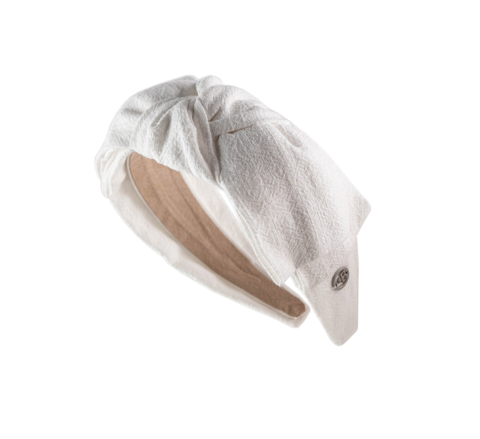 Vervaardigd in ons atelier, speelt dit hoofdjuweel met het perfecte evenwicht tussen Hoofdband en tulband. De dubbele, gedraaide knoop in linnen, subtiel asymmetrisch aan de zijkant, geeft het een unieke uitstraling: elegant zonder stijfheid.