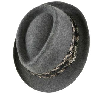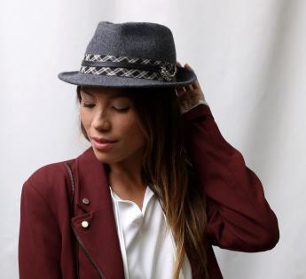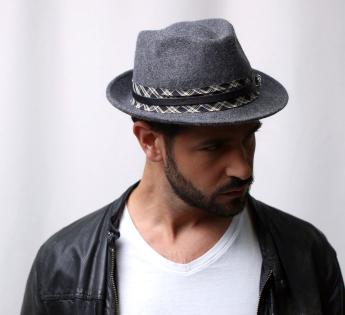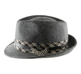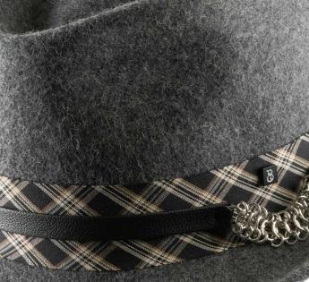 Trendy materiaalcombinatie voor deze Trilby hoed. Fris in stijl en warm in bedekking, zijn vilt is versierd met een dubbele hoedenband met een brede strook Schotse ruit, bovenop een fijne leren riem die een reeks gemetalliseerde ringen verbindt die een vleugje glans toevoegen. In zijn veelzijdigheid volgt de trilby de trends met nonchalance. Hij doorbreekt de tijd dankzij een sterk verheffend vermogen op alle outfits en bij elk evenement.