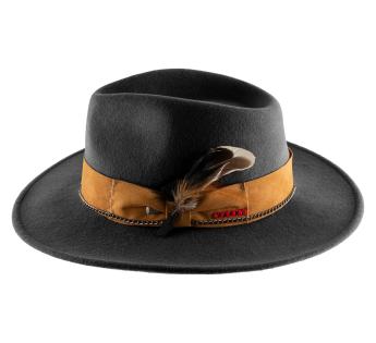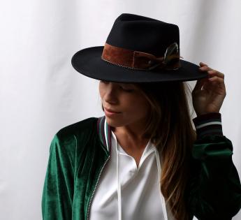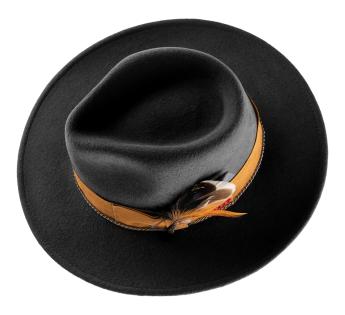 De combinatie van verschillende materialen en texturen is een van de modepraktijken van dit seizoen. Zie zelf deze doordachte combinatie van vilt en suède. Het resultaat is een klassiek hoed opstaand met een hoedenband in een vrolijke natuurlijke kleur, met succesvol aangebrachte stiksels, fantasieën en een veer. Zo genieten we van een creatie waaraan een mooie glans is toegevoegd.