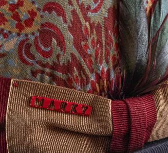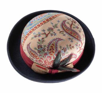 Een opvallend stuk in beperkte oplage, deze Bolhoed bedekt met vintage paisley stof onderscheidt zich door zijn unieke uitstraling. Elk exemplaar heeft een andere patroonplaatsing, waardoor elke hoed echt uniek is. Een zorgvuldig bewerkte trimmen, versterkt met een tweekleurig hoedenband en een hanenveer met groene en bordeauxrode tinten, tekent een gedurfde en verfijnde silhouet.