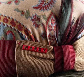 Een opvallend stuk in beperkte oplage, deze Bolhoed bedekt met vintage paisley stof onderscheidt zich door zijn unieke uitstraling. Elk exemplaar heeft een andere patroonplaatsing, waardoor elke hoed echt uniek is. Een zorgvuldig bewerkte trimmen, versterkt met een tweekleurig hoedenband en een hanenveer met groene en bordeauxrode tinten, tekent een gedurfde en verfijnde silhouet.