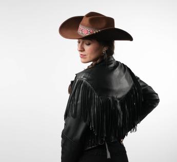 Western hoed met een bohemien stijl, vervaardigd in ons atelier in Lyon. Gemaakt van Italiaans wol vilt, warm en van nature waterbestendig, valt hij op door zijn brede, latte-kleurige rand die kan worden aangepast aan de gewenste look. Een ambachtelijke creatie ontworpen om de winter met elegantie en karakter te trotseren.