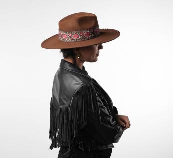 Het geborduurde band, met rijke bloemmotieven, voegt een vleugje exotisme en verfijning toe. Drie metalen sieraden bevestigd aan de rand voegen een originele en assertieve noot toe. Een kwaliteitshoed met een nomadische geest, perfect voor degenen die op zoek zijn naar een accessoire met een sterke persoonlijkheid.