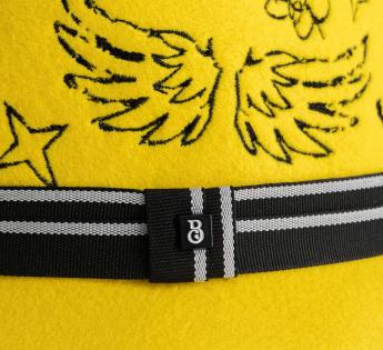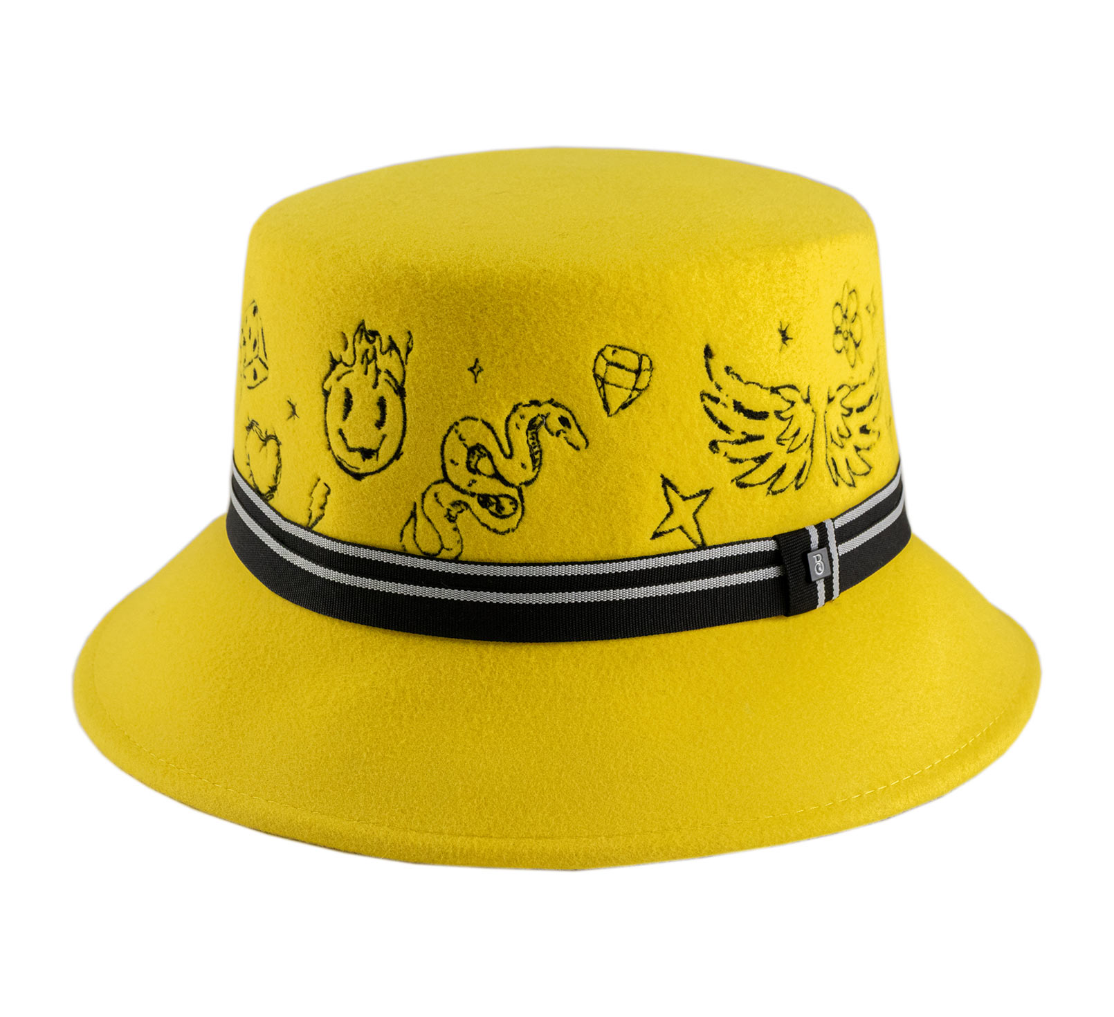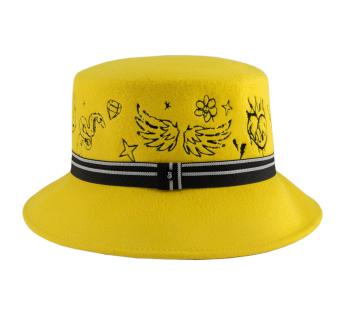 Kleurrijk, gedurfd en ultra-creatief, deze wol vilt vissershoed heruitvindt de codes van hoofddeksels. De platte kroon is volledig geborduurd met grafische tattoo-achtige patronen, voor een street en eigenzinnige touch. Het gestreepte hoedenband structureert het geheel, verfraaid met een metalen Label in het midden. Dit model trekt alle blikken naar zich toe, terwijl het een ware vrijheid van stijl uitstraalt.
