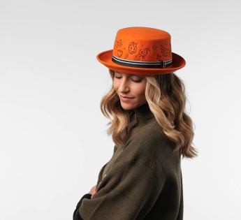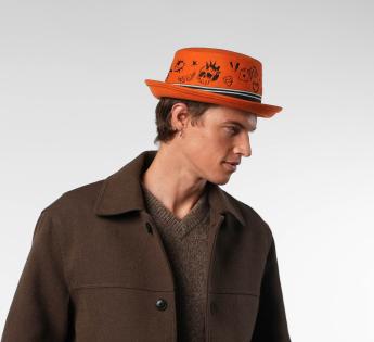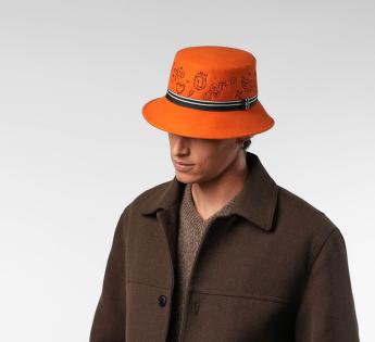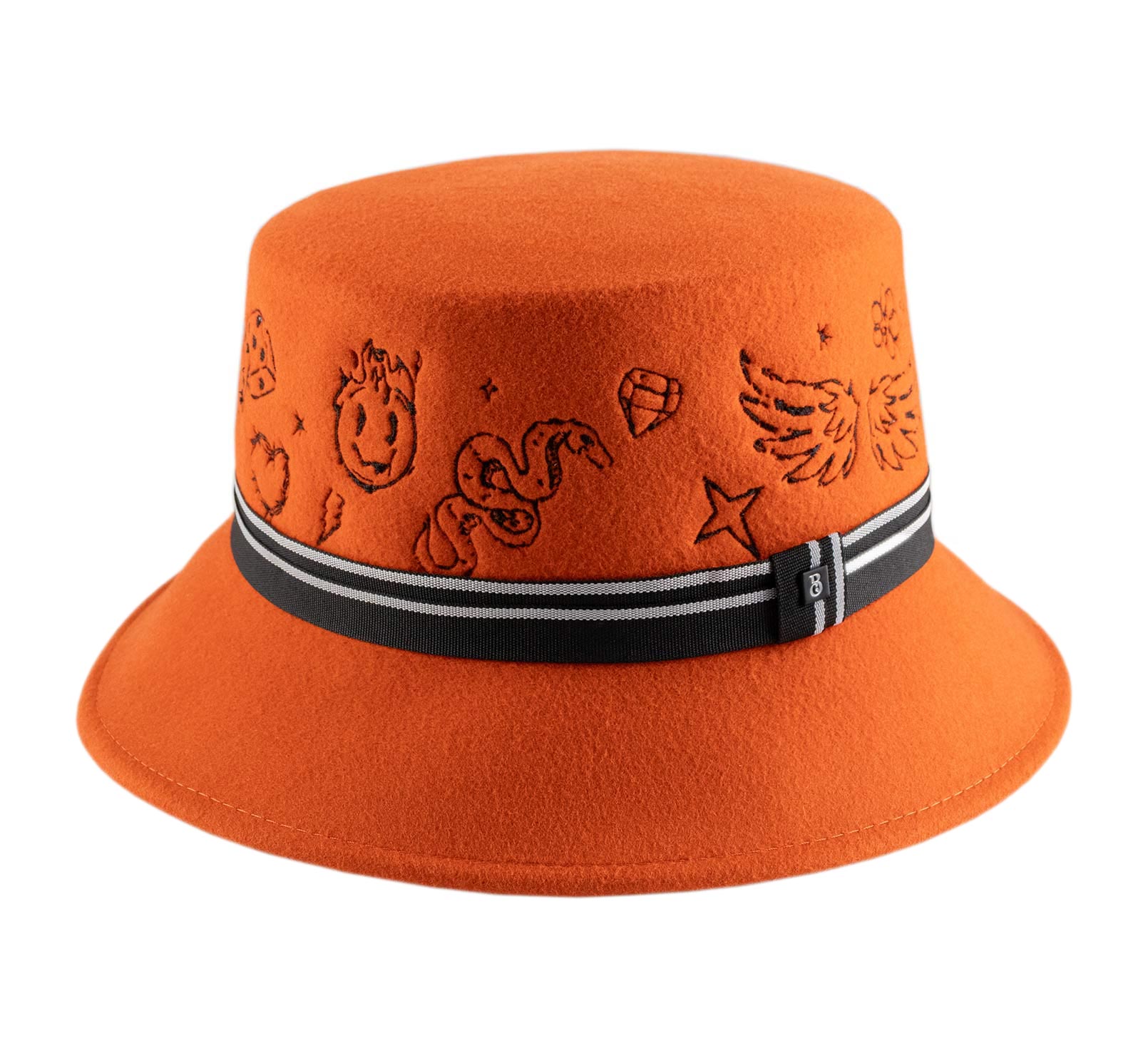 Kleurrijk, gedurfd en ultra-creatief, deze wol vilt vissershoed heruitvindt de codes van hoofddeksels. De platte kroon is volledig geborduurd met grafische tattoo-achtige patronen, voor een street en eigenzinnige touch. Het gestreepte hoedenband structureert het geheel, verfraaid met een metalen Label in het midden. Dit model trekt alle blikken naar zich toe, terwijl het een ware vrijheid van stijl uitstraalt.
