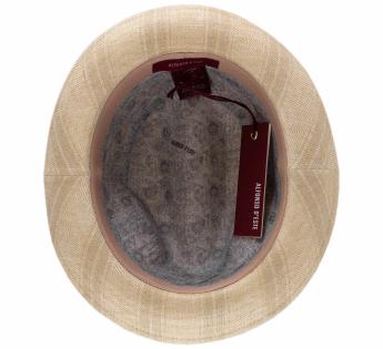 Deze hoed verleidt direct door zijn verfijnde eenvoud. De strakke lijnen, heldere tint en bijna ton-sur-ton visgraat geven een subtiel reliëf, vol elegantie en finesse.