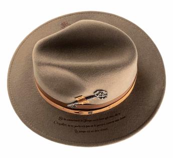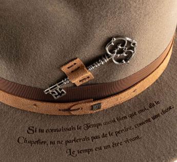 Volledig gevormd uit een dichte en gestructureerde wol vilt, herinterpreteert dit model de klassieke Traveller hoed vorm door een symbolische esthetiek geïnspireerd door het poëtische universum van Lewis Carroll. Een oude sleutel, bevestigd in plaats van de traditionele veer, wordt het embleem van het mysterie van de tijd, een directe knipoog naar de Gekke Hoedenmaker uit Alice.