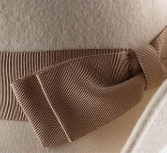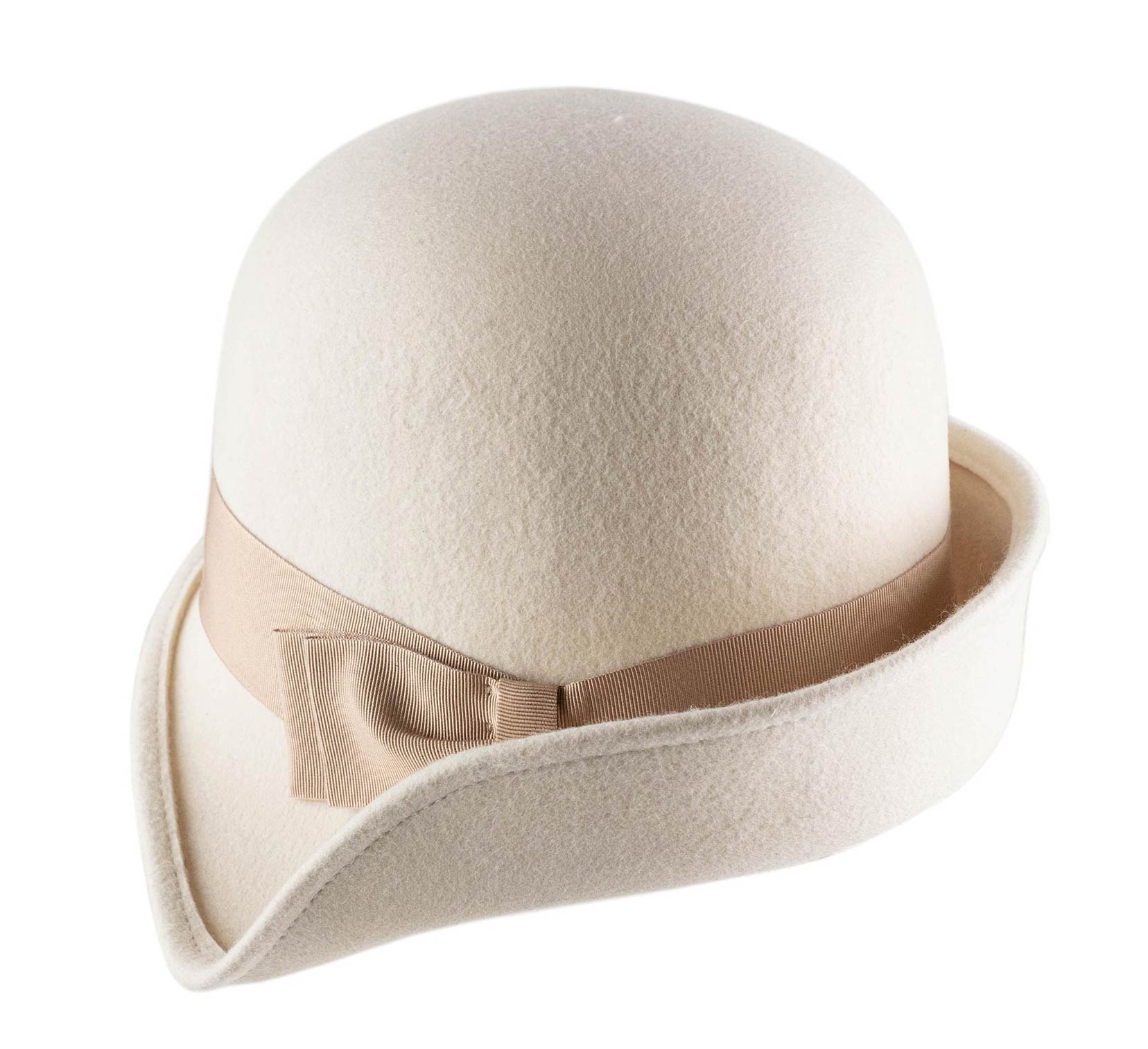 Met zijn elegante silhouet en hoge kroon, bevestigt deze Cloche hoed een uitgesproken retro stijl. De rand opstaand aan de voorkant geeft structuur aan de lijn en omlijst het gezicht zachtjes. Het ton-sur-ton hoedenband van grosgrain, afgewerkt met een platte strik, accentueert zijn verfijning zonder overdaad.
