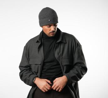 De geribbelde omslag voegt textuur en structuur toe aan de silhouet, terwijl het perfect op zijn plaats blijft. Dankzij het rekbare materiaal past het zich aan alle lichaamstypen aan. Dicht op het hoofd gedragen of in een meer ontspannen versie, deze muts past zich met eenvoud en elegantie aan ieders stijl aan.