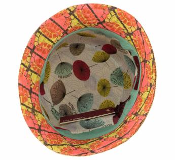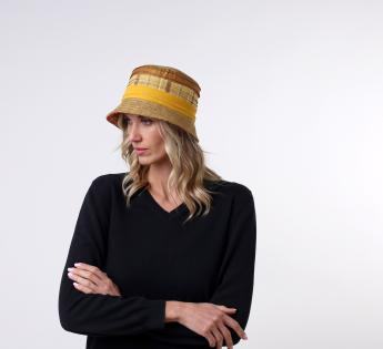 Atypische hoed met een vorm die oscilleert tussen de vissershoed en de retrobel. Hij is gemaakt van flueel van katoen en linnen met ruitmotief voor een uiterst comfortabele seizoen. Elke stofband is doorgestikt om volume te geven aan een soepel model dat we naar wens kunnen aanpassen. De onderkant van zijn rand is gekleurd voor een artistiek contrast.