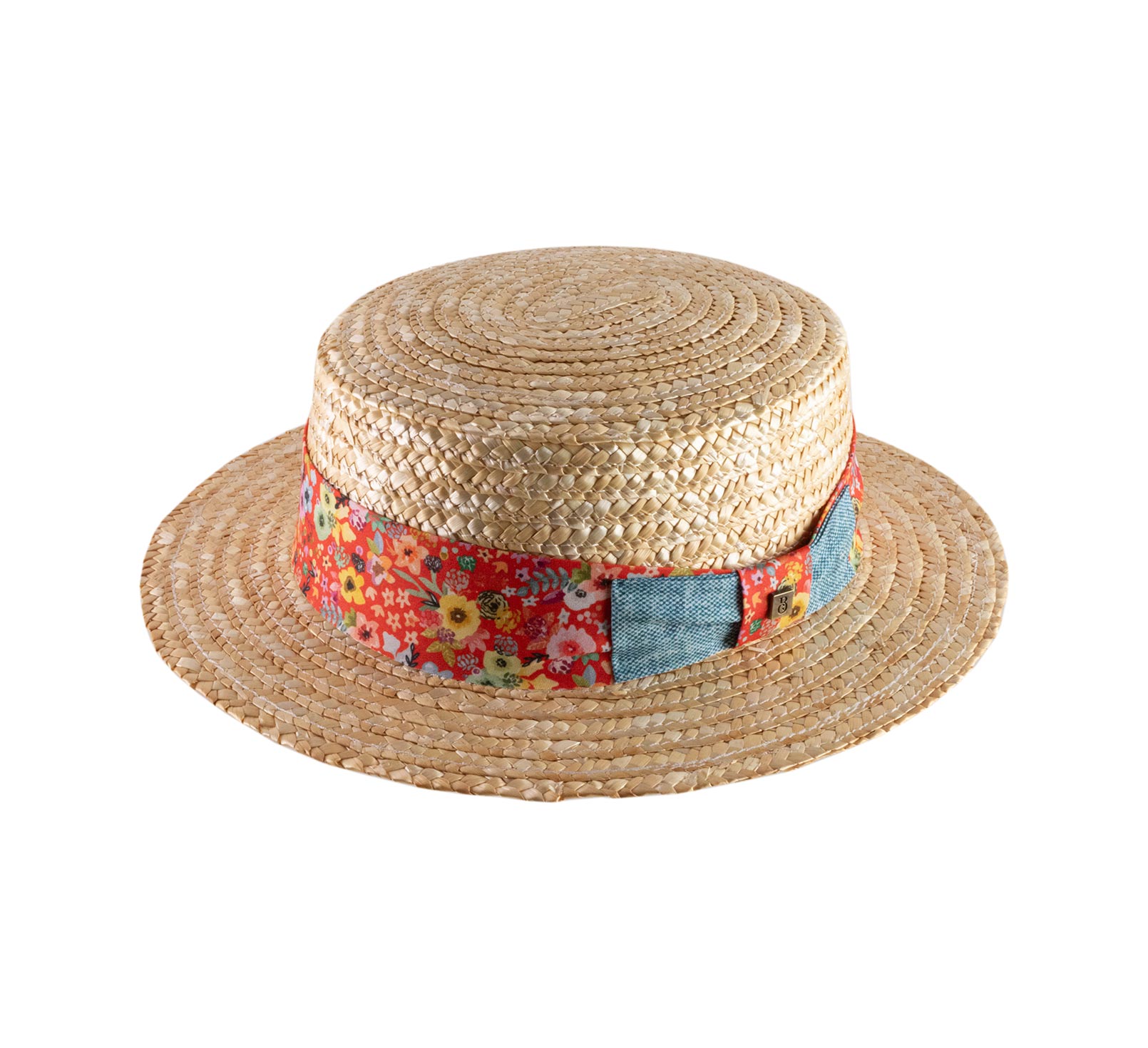 Canotier hoed voor kinderen, gemaakt van gevlochten stro dat vervolgens is genaaid. Het is versierd met een hoedenband met bloemen. En de ring daarvan is compleet met de pin van ons merk BCBG Couture.
