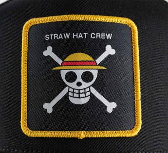 Toon je passie voor One Piece met deze opvallende trucker pet! Het geborduurde embleem van Luffy's Jolly Roger en de contrasterende stiksels geven het een unieke stijl.