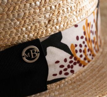 Een hoed met vele gezichten die speelt met het zomerse licht. De band met botanische motieven toont abstracte, contrasterende en kleurrijke patronen.