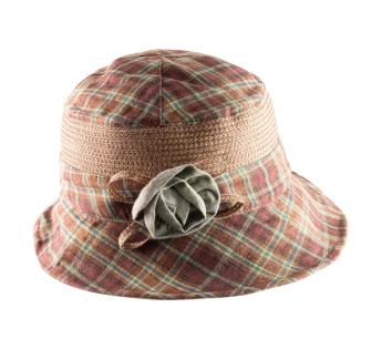 Vrouwelijke zomerhoed versierd met een afneembare broche met een stoffen bloem. Het is een mix van genaaid stro en stof met een ruitmotief in brons. De kroon is omringd door een rand die naar wens kan worden aangepast. Het ontwerp maakt verschillende stijlen mogelijk om telkens een mooie, casual touch aan onze uitstraling toe te voegen.