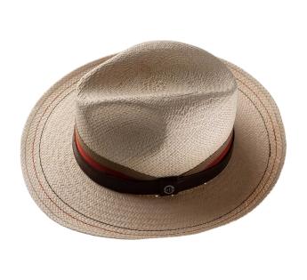 Licht en elegant, deze Panama hoed is voorzien van een ceintuur met verschillende texturen, waarin leer, satijn en grosgrain samenkomen in een subtiel kleurenpalet.