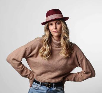 Trilby hoed versierd met een strakke hoedenband met grote zigzagpatronen die een kroon in de vorm van een druppel omringen. Elegant en tijdloos, de trilby is hier verfijnd voor een ongelooflijk draagcomfort. Hij is waterbestendig dankzij de strakke viltbewerking, wat ook zorgt voor een verbeterde bescherming.