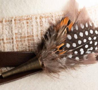 Winterhoed van wol vilt, verfraaid met een exquise samenstelling van veren op een verouderde gouden steun. De hoedenband is gemaakt van een materiaal met tweed-effect in beige tinten. Uiteindelijk is hij omzoomd met een band van kunstleer om deze chique en bohemien sfeer te creëren. Hij zal ongetwijfeld gemakkelijk onze garderobe opwaarderen.