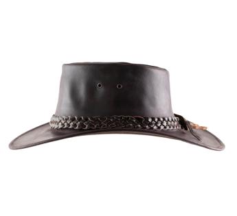 Australische hoed gemaakt van glad leer en versierd met een gevlochten leren band met 4 dikke strengen. Het materiaal is eigenlijk kalfsleer, vervaardigd met de beste selectie leer. Deze keuze biedt het model comfort en robuustheid voor aangename en langdurige ervaringen.