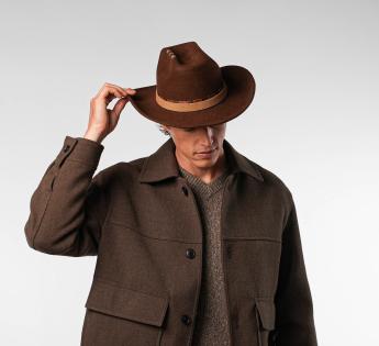 Rauw charisma en westerse allure voor deze cowboyhoed, vervaardigd in onze werkplaats in Lyon. Zijn hoogwaardige vilt beschermt je zowel tegen windvlagen als tegen ochtendkou. De hoge kroon met platte bovenkant en de iets opgetrokken brede rand roepen de authenticiteit van de grote buitenruimtes op. Fijne borduursels aan de bovenkant, een knipoog naar de codes van het Wilde Westen, voor een verfijnde en onderscheidende afwerking.
