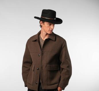 Rauw charisma en westerse allure voor deze cowboyhoed, vervaardigd in onze werkplaats in Lyon. Zijn hoogwaardige vilt beschermt je zowel tegen windvlagen als tegen ochtendkou. De hoge kroon met platte bovenkant en de iets opgetrokken brede rand roepen de authenticiteit van de grote buitenruimtes op. Fijne borduursels aan de bovenkant, een knipoog naar de codes van het Wilde Westen, voor een verfijnde en onderscheidende afwerking.